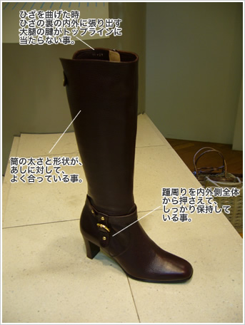 足部のチェックポイントは短靴とほとんど同じです。脚部はいずれのタイプもくるぶし周辺の踵周りを全体から軽く押さえて、ここがしっかり保持されていることを確認してください。また、ハーフ以上の丈では、筒の太さと形状が脚に対して合っていることが大切です。ロングブーツは膝を曲げた時にトップラインが太ももに当たらないことをチェックします。