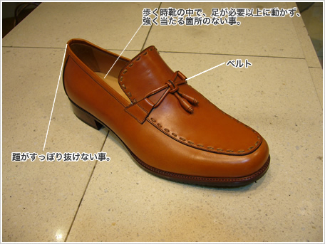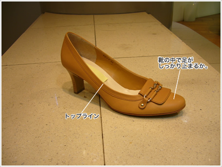 パンプスは留め具も締め具も無い履き口の浅い靴なので、チェックポイントは靴の中で足がきちんと保持されるかの1点に絞られます。フィッティングするのが難しい靴のため、経験豊富なシューフィッターに慎重にチェックしてもらうことをお勧めいたします。
