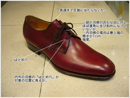 いずれも履いたとき内外の羽根のはとめ穴が対称の位置にあって、羽根に対し紐が直角に並んでいることを確認しましょう。