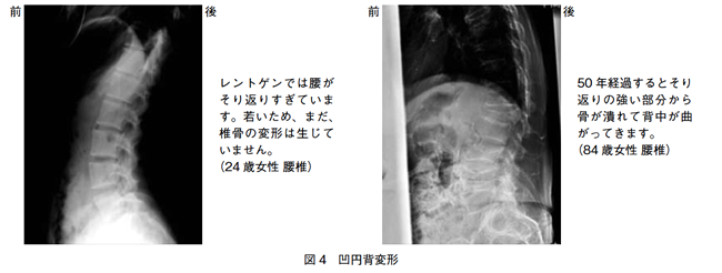 覚えていただきたい姿勢には5 つのパターンがありますが代表的なものを説明します。よく見られる悪い姿勢の一つは、凹円背変形と言います。(図4)