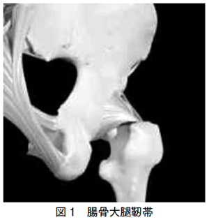 股関節の安定化の仕方の中で、数パターンがのちの不良姿勢を生むことになります。驚くことに、4 足歩行から2 足歩行に変わった時、股関節が伸展したため、股関節の前方には関節を安定させる筋肉はありません。股関節の前方にあるのは靱帯です。人のからだで一番太く、骨盤と大腿骨をつなぐ靭帯で、腸骨大腿靱帯と言います。(図1)